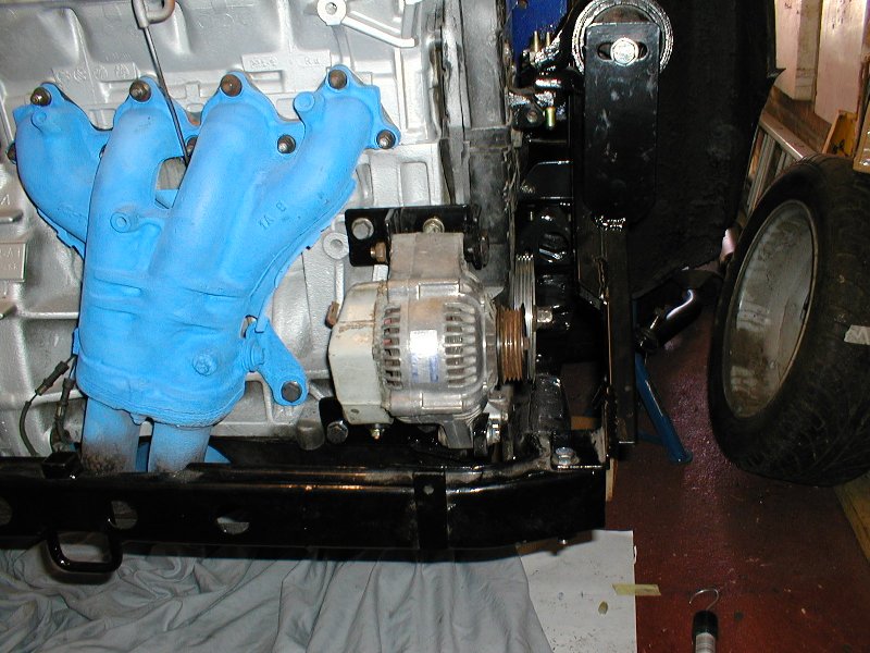 dash panal, further work is required to sort this out. NOTE: Ended up cutting a bit off the front of the subframe and giving the bulkhead a couple of good hits with a big hammer to get the clearance for the hoses, the engine is also as far forward in the mounts as possible. 5. Lower alternator bracket holes do not align and also hits a lug on the engine, there is also a gap between the bottom bracket and the alternator adjuster. |