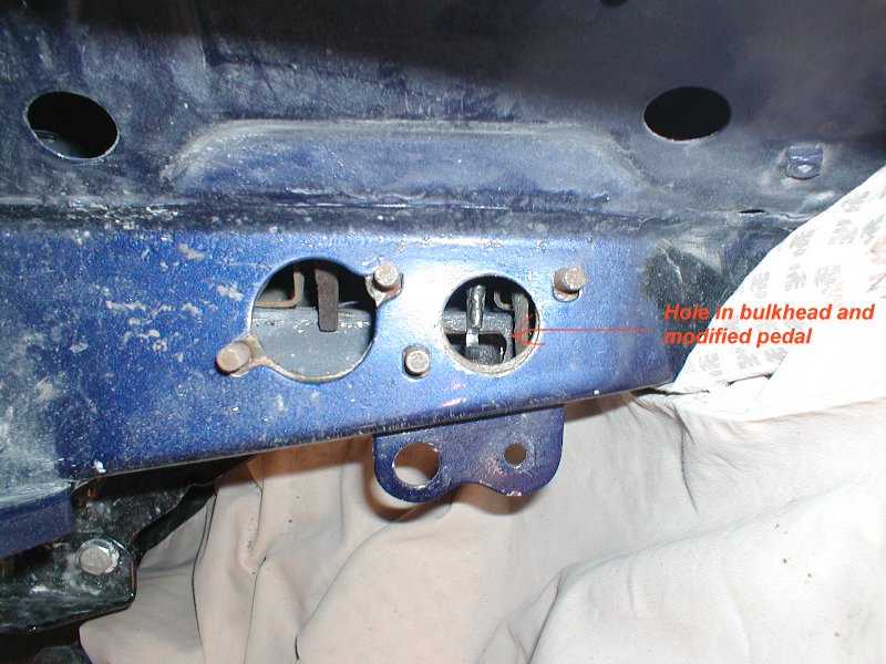 You can just see the hole were the cable will pass through the bulkhead and the modofied clutch pedal |