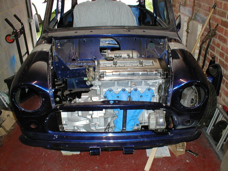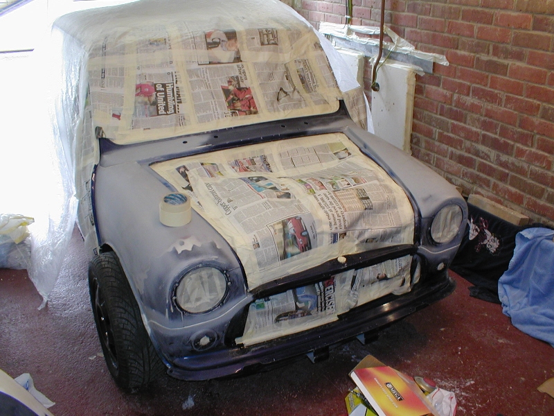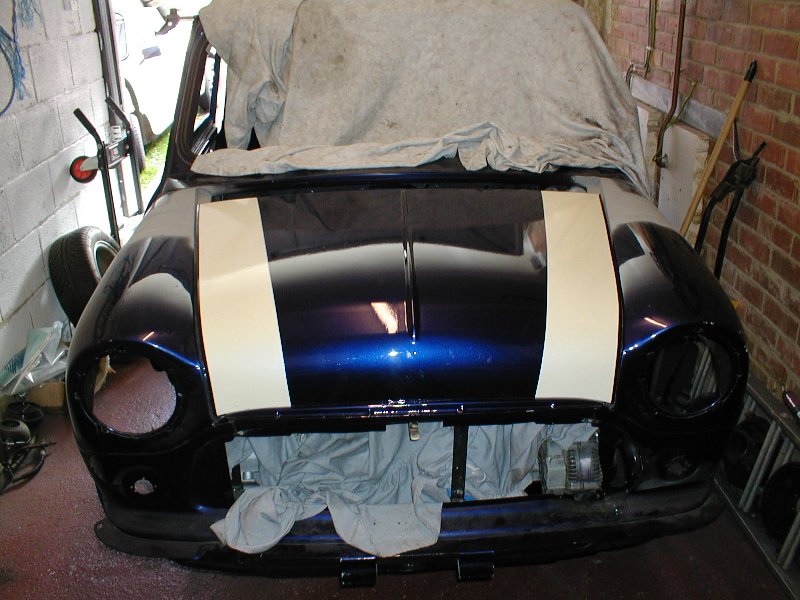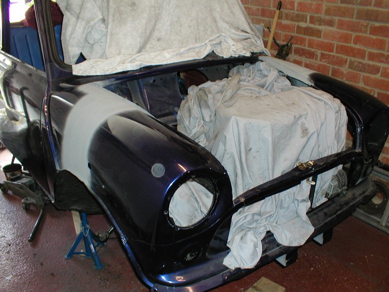 | I have used spacer plates rather than new wings to extend the front (cost saving measure) Having tacked the wings on the extension needed is 110mm not the expected 90mm, I don't see how 90mm extension can be used as the front panal already needs cutting to clear the alternator. A good friend is going to do the filler work for me as he is an exellent sprayer/bodywork technician. Due to the high cost I have been quoted for painting the front of the mini I have decided to do it myself, it has cost £295 for all of the equipment and paint. |