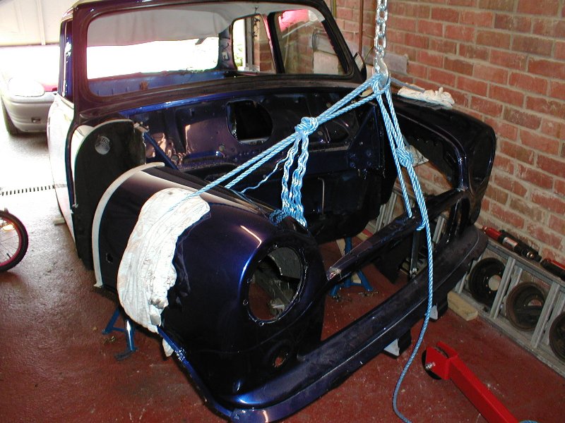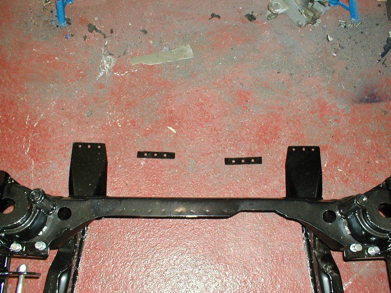 1. Remove front subframe 2. Remove front of car 3. Remove inner wings 4. Remove steering rack mounting bracket 5. Trim inner wings were subframe mounts 6. Remove captive nuts from bulkhead 7. Cut new hole for steering rack 8. Make 2 reinforcing brackets for the subframe floor mountings |
