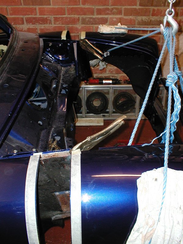 Repaired hole N/S, strip of metal clamped in place for extension |