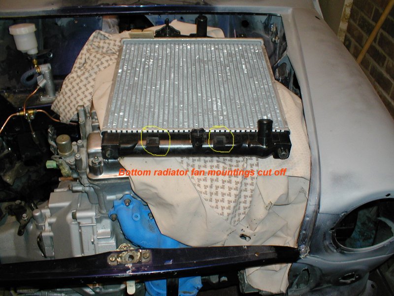 Not very clear but just visible the bits that have been cut off the rad so that it will fit. |
