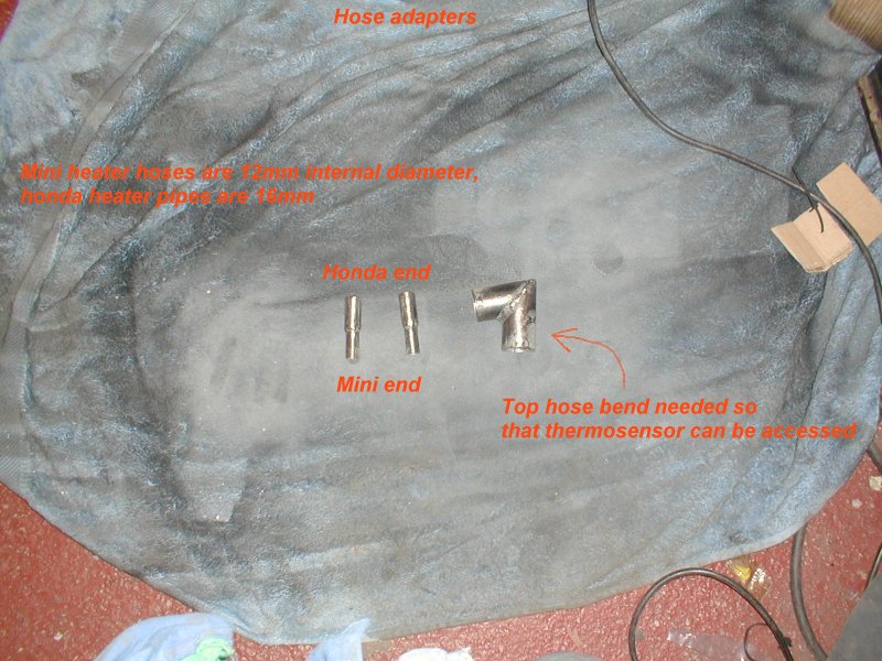 Hose adapters - mini heater rad hoses are 12mm internal diameter, honda heater pipes are 16mm. |
